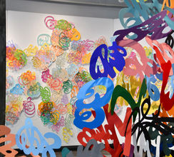 Overlay: Language Uncovered presents a series of installations that address my experience navigating learning challenges during my formative years, and strategies I have developed for thriving within those educational settings. This body of work represents three years of introspection and research, leading to a deeper acknowledgement and understanding of the obstacles I faced in learning. The installations feature large-scale sculptures made from a range of materials including, vinyl, styrofoam, acrylic, paper, silk screen mesh, metal and light. The immersive and vibrant colors within these installations invite viewers to playfully explore and interact with language, all rooted in my personal experiences as someone with a learning disability. Working on this body of work has provided valuable perspective on the underlying reasons for my struggles with learning and has fostered a deeper appreciation for the individuals who have supported and guided me along the way.